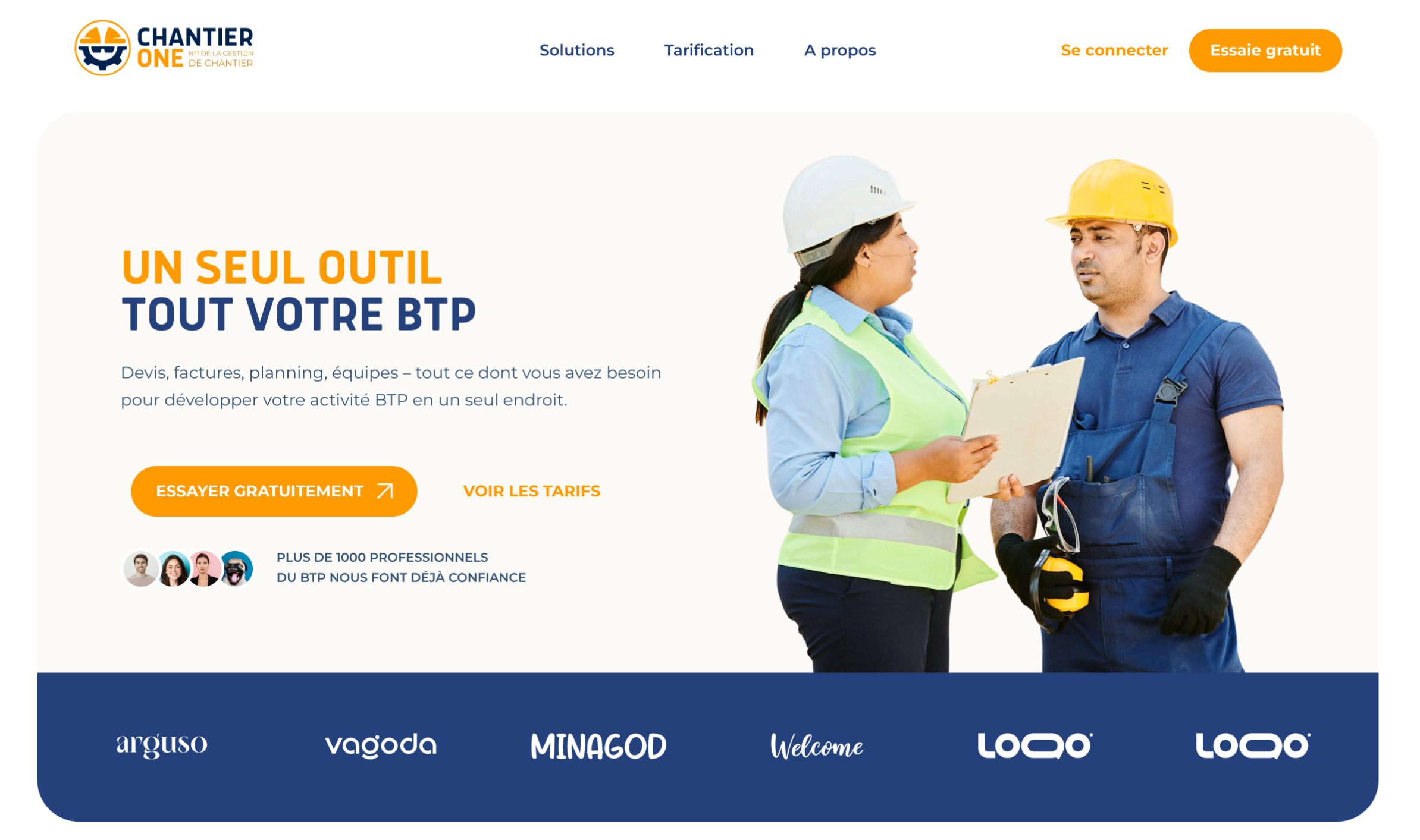 ChantierOne simplifie la gestion de milliers d’entreprises du BTP à travers la France. De l’artisan solo à l’équipe de 20 personnes, nos utilisateurs gagnent du temps, de la visibilité et de la sérénité dans leur quotidien.